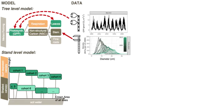 Forest stands show strong structural heterogeneity in the size distributions of individual trees. This is driven by growth and mortality and results in allocation of carbon to different biomass pools. Diverse turnover times of these pools thus affect the net carbon balance of forest ecosystems. Resolving this heterogeneity of vegetation structure in models of the biosphere is crucial to correctly predict the effect of climate change induced alterations of photosynthetic activity on the ecosystem carbon balance.